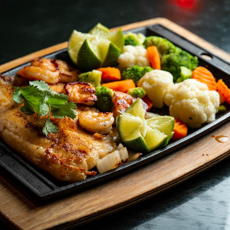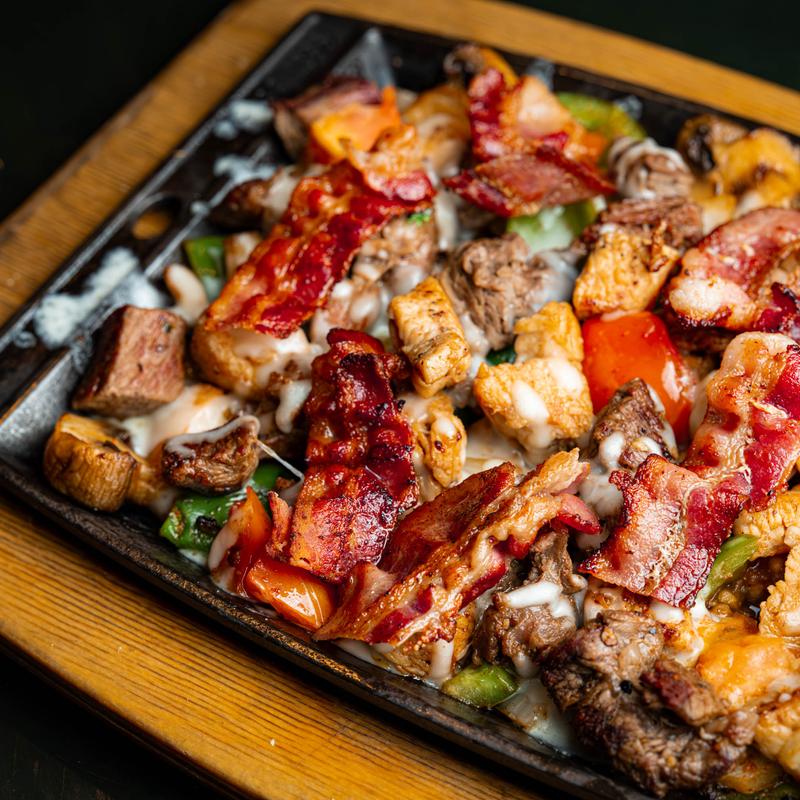 Sizzling hot marinated steak, chicken, or shrimp prepared with bacon, onions, tomatoes, bell peppers, mushrooms, chorizo, and mozzarella cheese. Served with tortillas and a side of rice and beans.