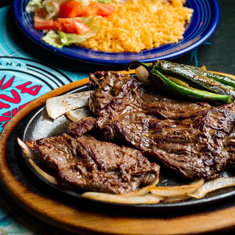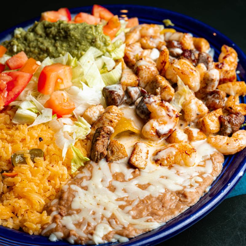 Grilled 4 oz steak and 4 oz chicken breast, served with chorizo, all on a bed of grilled onions and your choice of rice or beans.