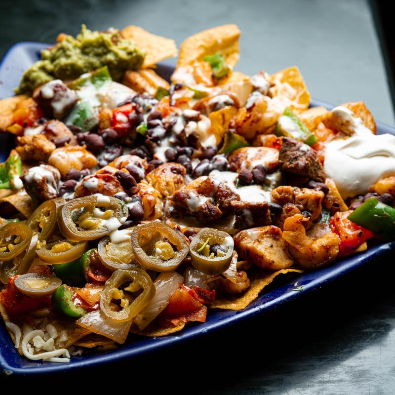 Flour tortilla chips smothered with beef, chicken, lettuce, tomatoes, guacamole, sour cream, and jalapenos, and topped with cheese sauce.