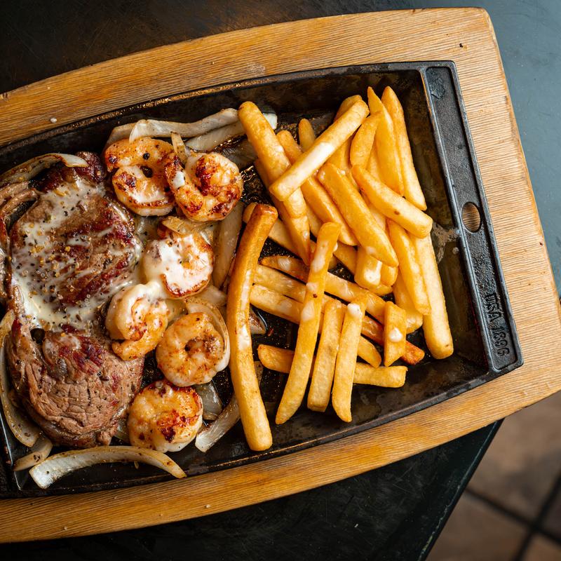 Seasoned 4 oz steak grilled with onions and served with a half-dozen shrimp. Topped with cheese sauce and served with a side of French fries or black beans.