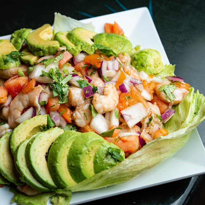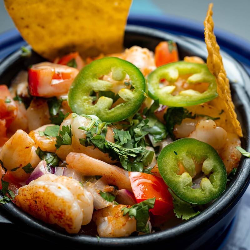 Shrimp, cut into small pieces and cured in lime juice. Mixed with pico de gallo, olive oil, and oregano.